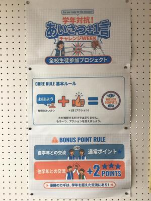 2月4日(水)あいさつ+1言 投稿: 学校管理者 (02/05) 生徒会の取組で「あいさつ+1言」を実施しています。 あいさつには、相手に安心感を与え、心理的な距離を縮めることで信頼関係やコミュニケーションを円滑に進める効果があります。 さらに一言つけ加えることで、ポジティブな気持ちになれるようにと取組を考えました。 この取組をきっかけに、笑顔あふれる学校生活になればいいですね😁